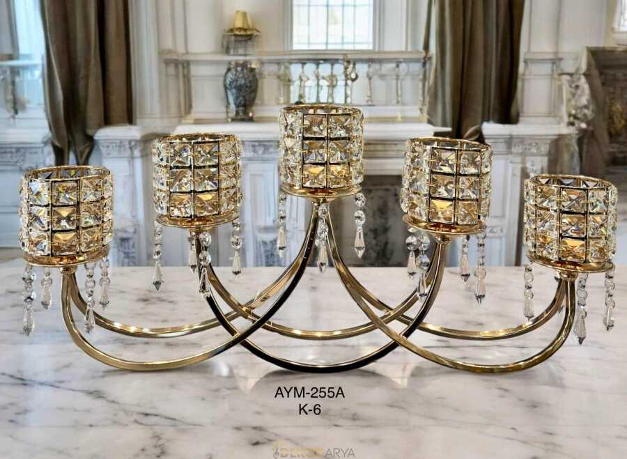 Parlak taşları, sarkaç kristalleri, ve göz alıcı rengiyle 5li yatay mumluk dekorarya'da. Salonlarda konsol üzerinde kullanılabilir, ayrıca çok yüksek olmadığı için yemek masası üstünde de kullanılabilir.