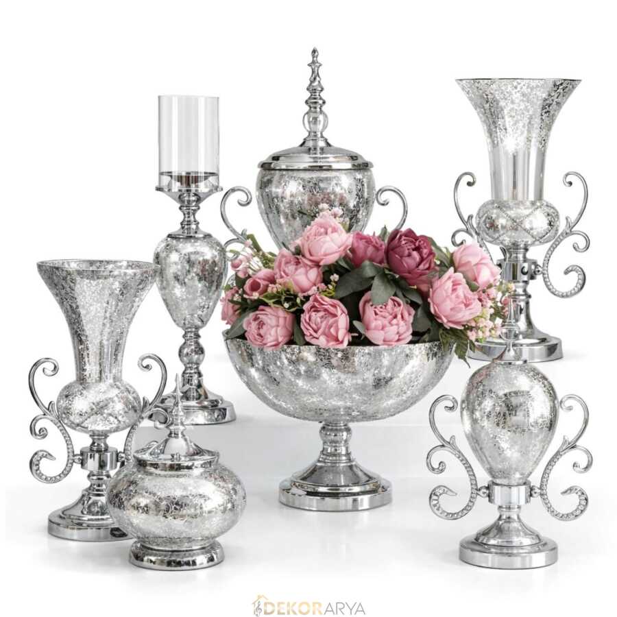 Özellikle açık renkli mobilyalar, aynalı yüzeyler ve metal detaylı aksesuarlarla birlikte kullanıldığında gümüş tonların zarafeti daha da ön plana çıkar. Misafir ağırlanan salonlarda veya giriş konsollarında sergilendiğinde bulunduğu ortama düzenli ve tamamlanmış bir görünüm kazandırır.