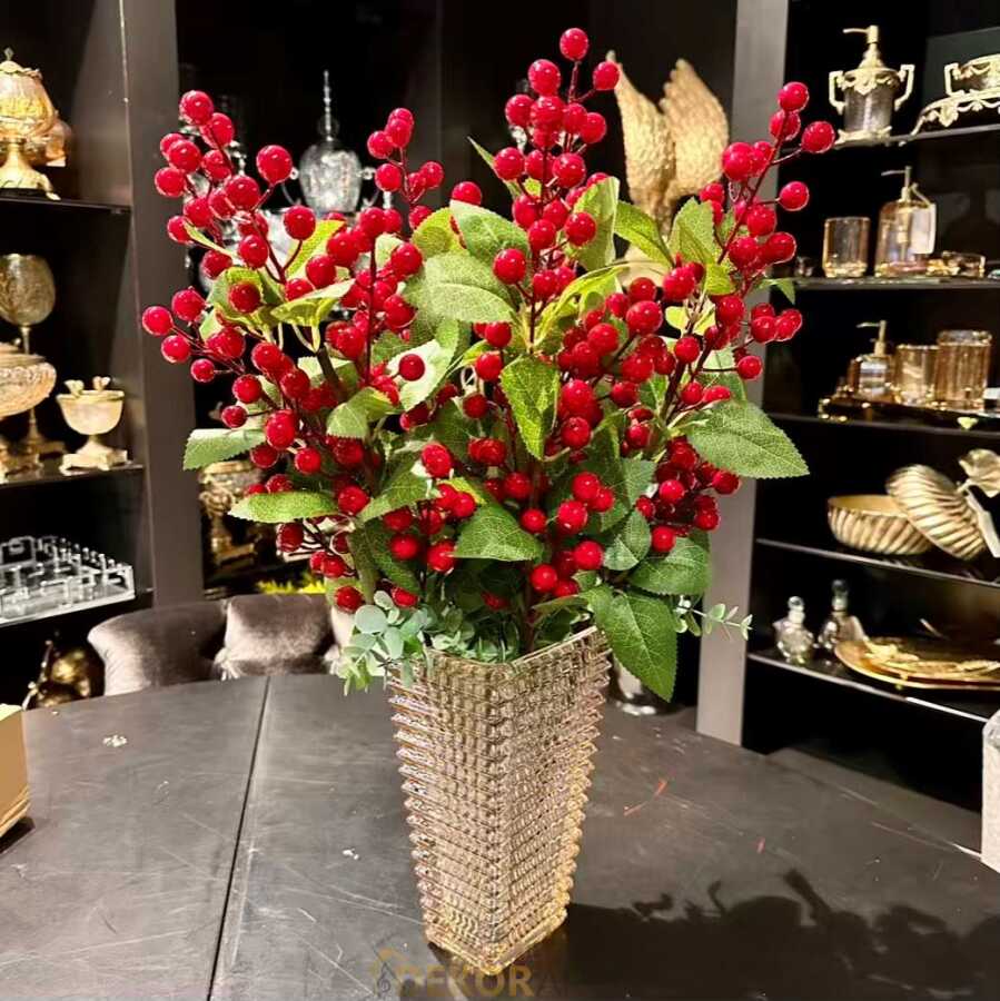 Kırmızı meyve formlu dalları ve yeşil yapraklarıyla canlı, dolgun bir görünüm sunar.