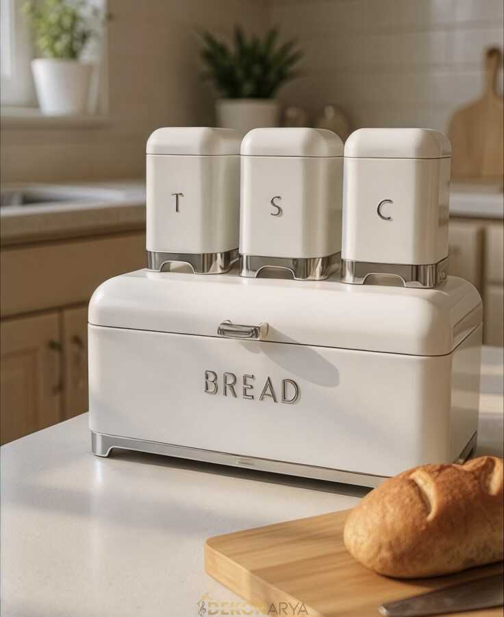 Çay Kahve Şeker Kavanozu & Ekmek Kutusu Seti – Beyaz Gümüş