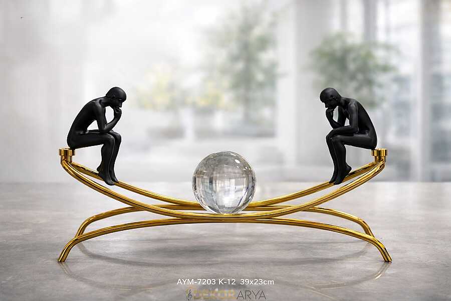 Modern sanatın zarafetini yaşam alanlarınıza taşıyan Düşünen Adam figürlü denge objesi, estetik ve anlamı bir araya getiriyor. Gold metal kaidesi üzerinde dengede duran iki figür ve ortadaki cam küre, hayatın denge ve düşünce kavramlarını simgeler.