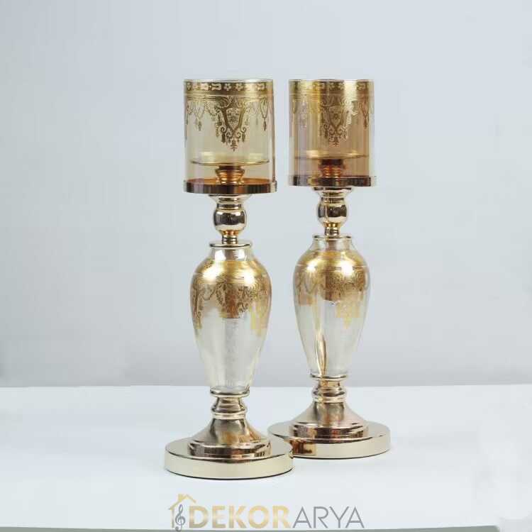 Altın desenlerle süslenmiş amber cam gövde, ışığın her temasında büyüleyici bir yansıma oluşturur.