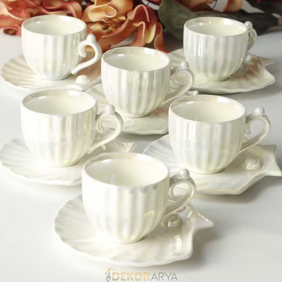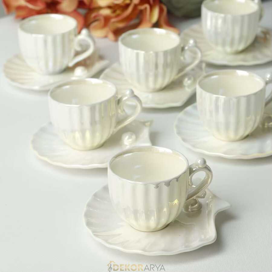 Deniz kabuğundan ilham alınarak tasarlanan İncili Türk Kahvesi Fincan Takımı, zarif parlak dokusu ve incili detaylarıyla kahve sunumlarınıza büyüleyici bir şıklık katar. 6 kişilik set olarak hazırlanan bu özel fincan takımı, hem günlük kahve keyiflerinde hem de özel misafir sunumlarında masanıza estetik bir hava katar.