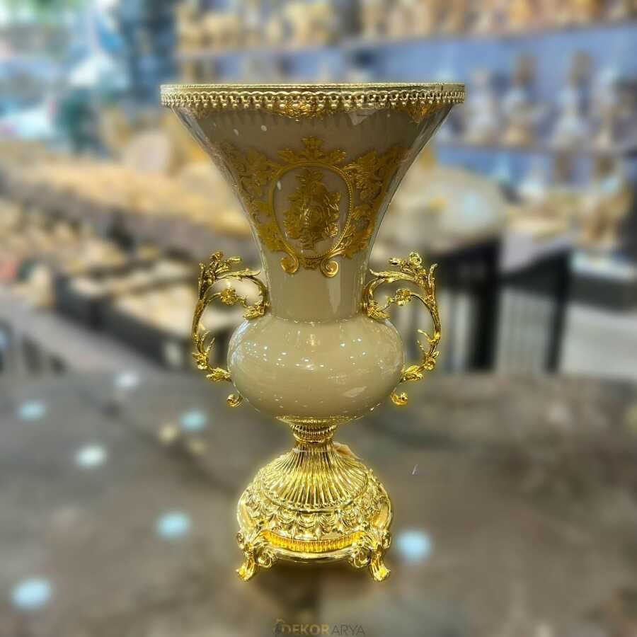 Kız isteme çiçek aranjmanları, nişan çikolatalıkları veya salon dekorlarında kullanılmak üzere tasarlanan bu vazo ve kaseler, inci beyazı ve kapiçino tonlarının altınla buluştuğu ışıltılı bir görünüm sunar.