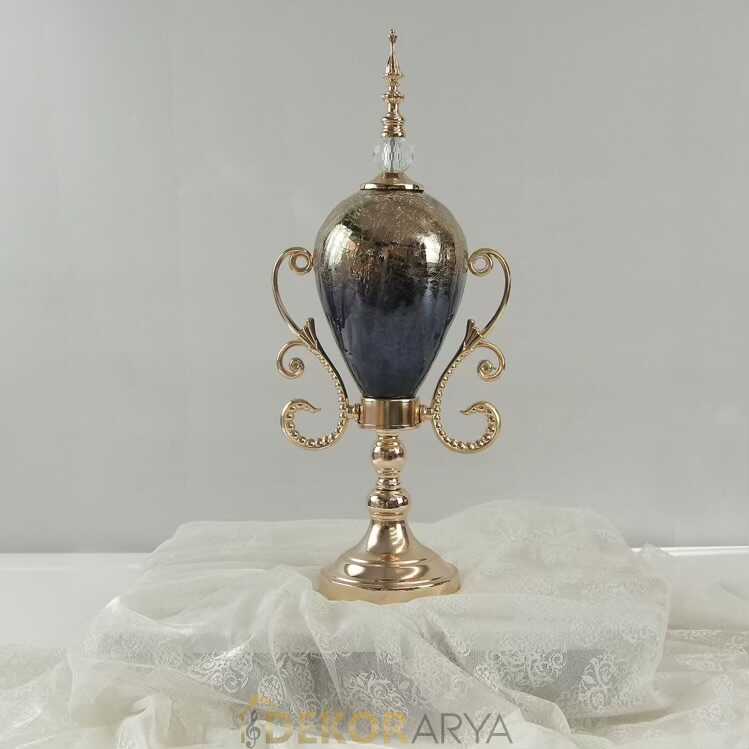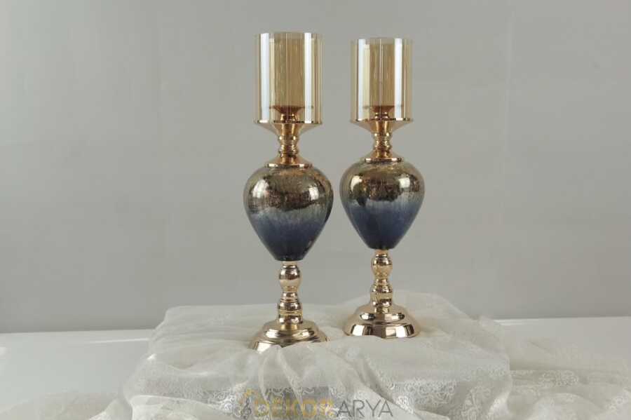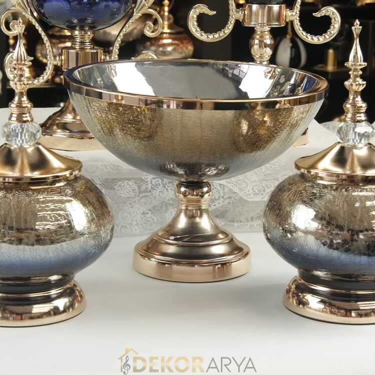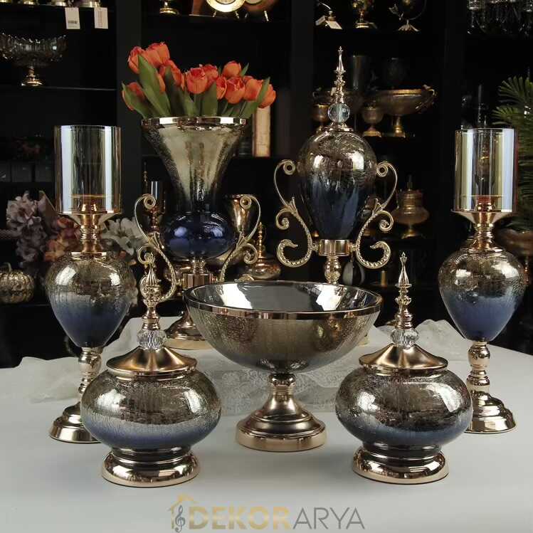Altın detaylarla tamamlanmış lacivert cam işlemeli 7 parçalı salon aksesuar seti. Gösterişli formu ve ışıltılı yüzeyiyle salonunuza lüks bir hava katıyor. Vazolar, şamdanlar, kapaklı kavanozlar ve ayaklı kaseyle bütünleyici bir şıklık sunar.