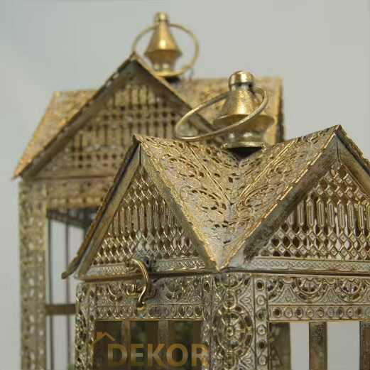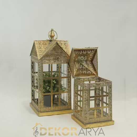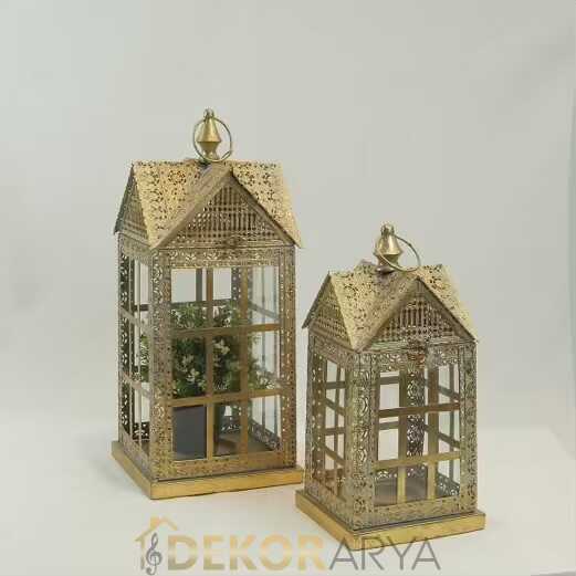 Küçük birer ev biçiminde tasarlanmış bu ikili fener, cam panelleri ve ince işçilikli metal çatısıyla adeta evinizin içinde minyatür bir mahalle kuruyor. Altın patina yüzey zamanın izlerini taşıyan bir sıcaklık verir; ışık fenerin içinden huzurla süzülür.