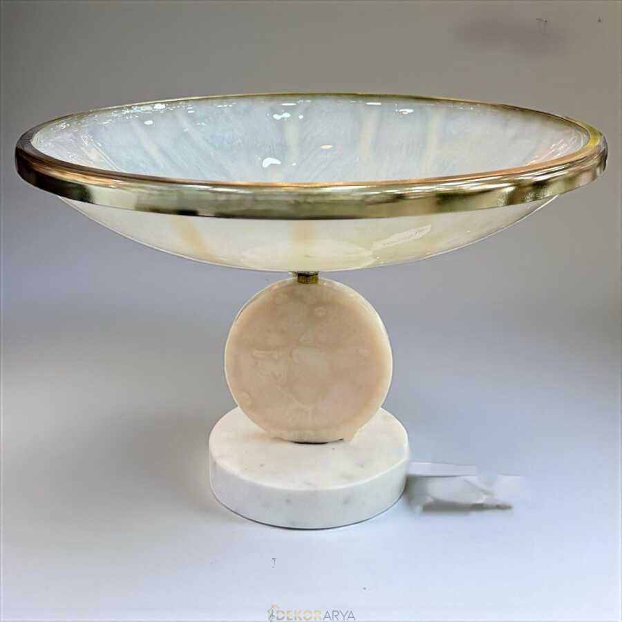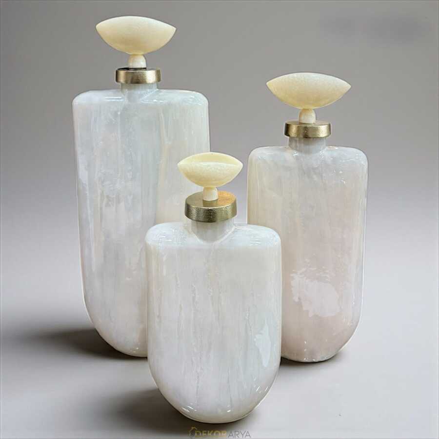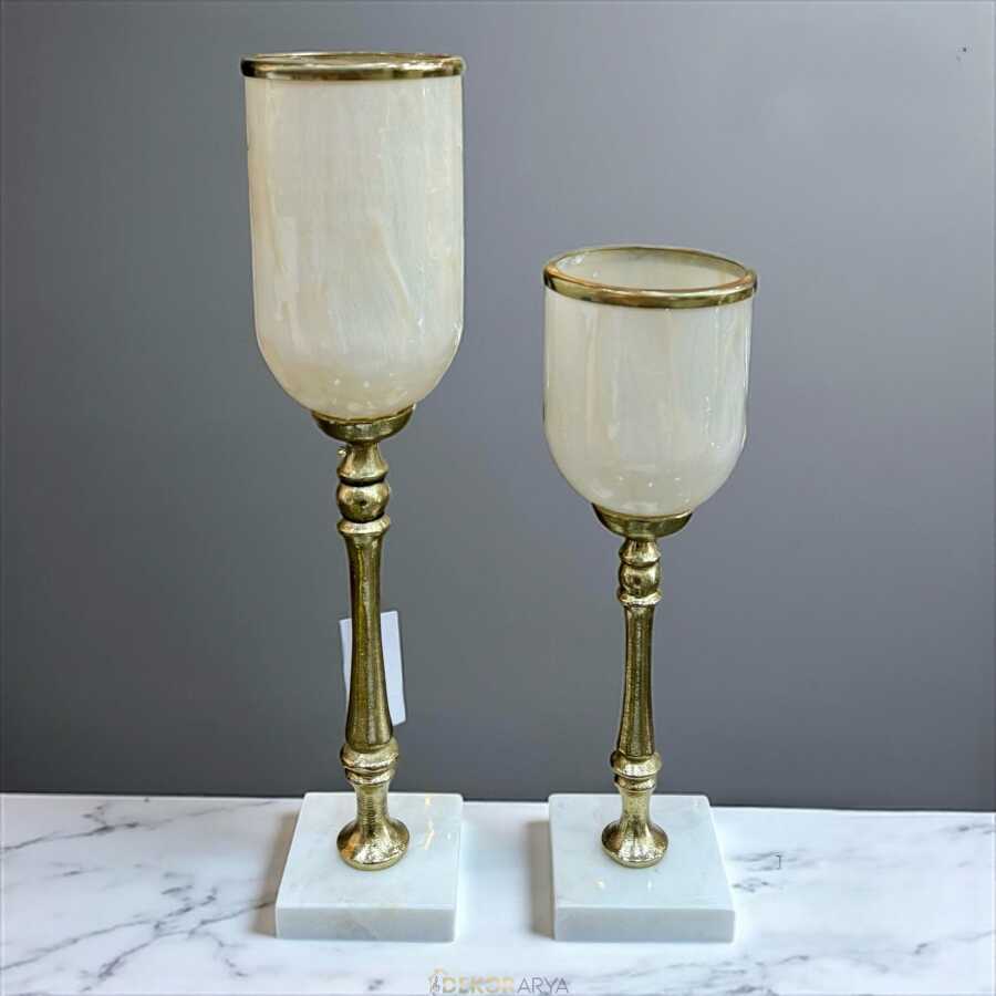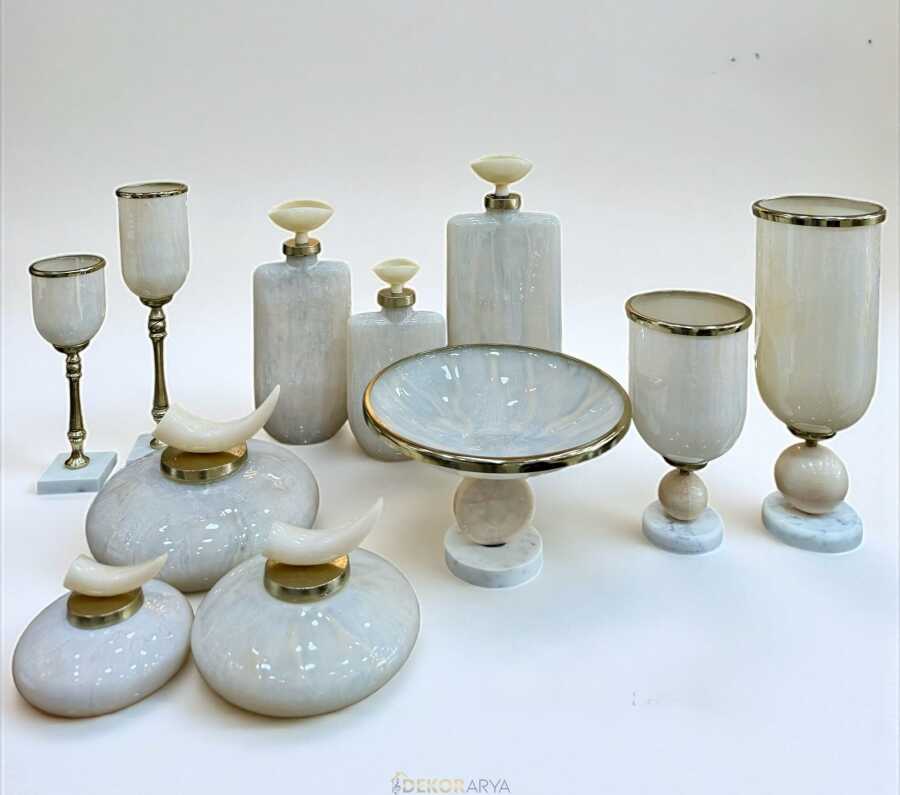 Set; farklı boylarda dekoratif kavanozlar, ayaklı kadehler, şişe formunda objeler ve geniş formlu kaselerden oluşur. Her parça mermer taban üzerine oturtulmuş metal detaylarla bütünleşmiştir.