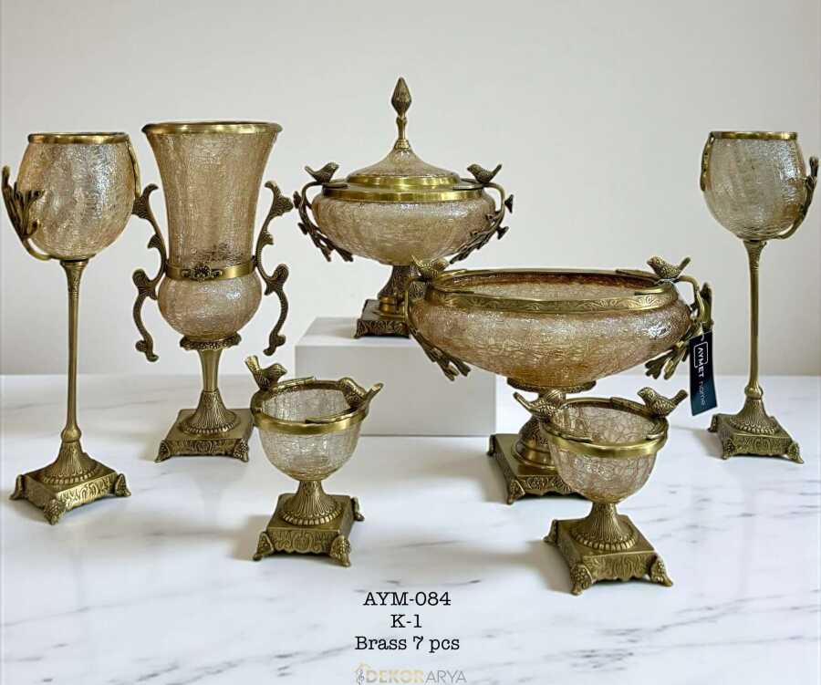Mitolojik Anka kuşunun zarafetinden ilham alan bu 7 parçalı pirinç kaplama dekoratif salon aksesuar seti; çatlak cam işçiliği ve barok tarzı detaylarıyla öne çıkıyor. Şamdanlar, vazo, ayaklı kaseler ve kapaklı kase ile tamamlanan bu özel takım; salonunuza hem tarihi bir ihtişam hem de modern bir lüks dokunuş katar. Antik pirinç tonlarıyla birleşen cam yüzeyler, her mekânda büyüleyici bir atmosfer yaratır.