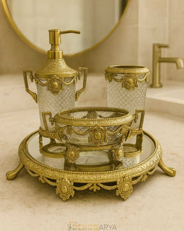 Özel tasarım altın pirinç ve kristal banyo seti, banyonuza sofistike bir şıklık katar.