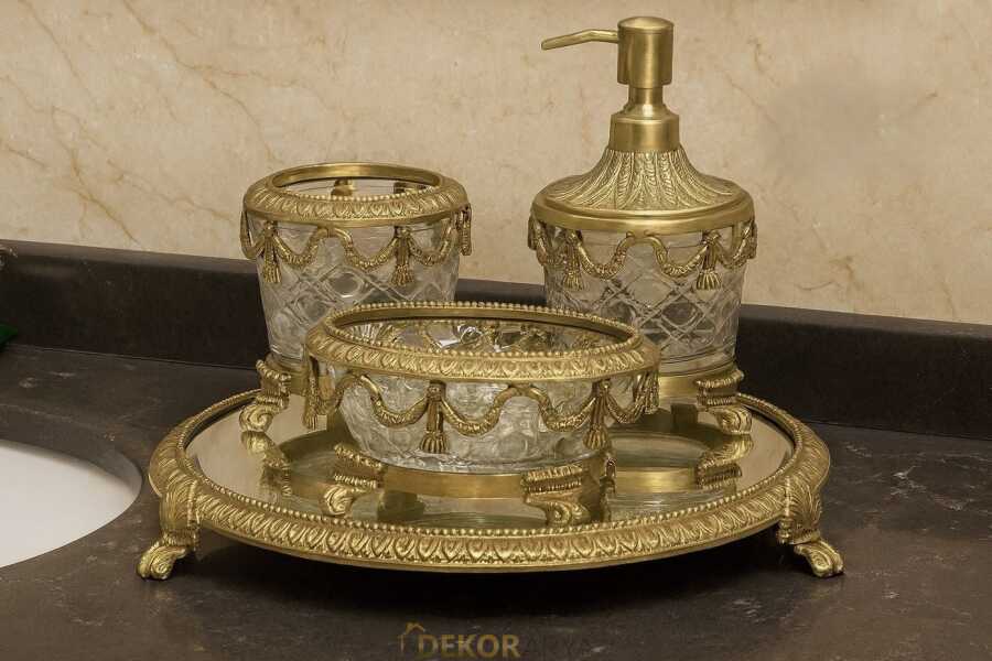 Altın desenli pirinç ve kristal banyo seti, banyonuza zarafet ve lüks bir dokunuş katar.