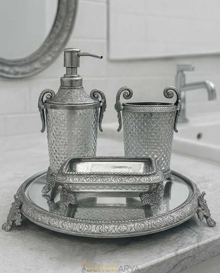 Gümüş kulplu pirinç ve kristal banyo seti, zarif detaylarıyla banyonuza modern bir dokunuş yapar.