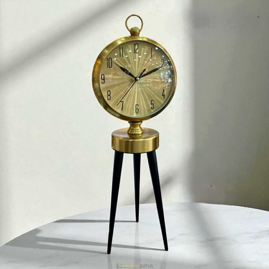 İç kısmındaki altın yansımasıyla göz kamaştıran bu masa saati, zarif çerçevesi ve üç ayaklı formuyla hem modern hem de retro bir hava taşır. 47x16 cm ölçüsüyle salon, antre veya ofis dekorasyonuna ihtişamlı bir dokunuş ekler.